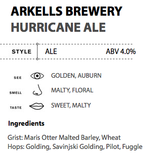 Only available straight from the keg. Naturally, Arkell's Hurricane Ale uses the lemony Pilot hops which, when combined with Maris Otter Malt, give the beer a delicious, well-rounded finish - like a Hurricane coming into land. A refreshing amber ale.