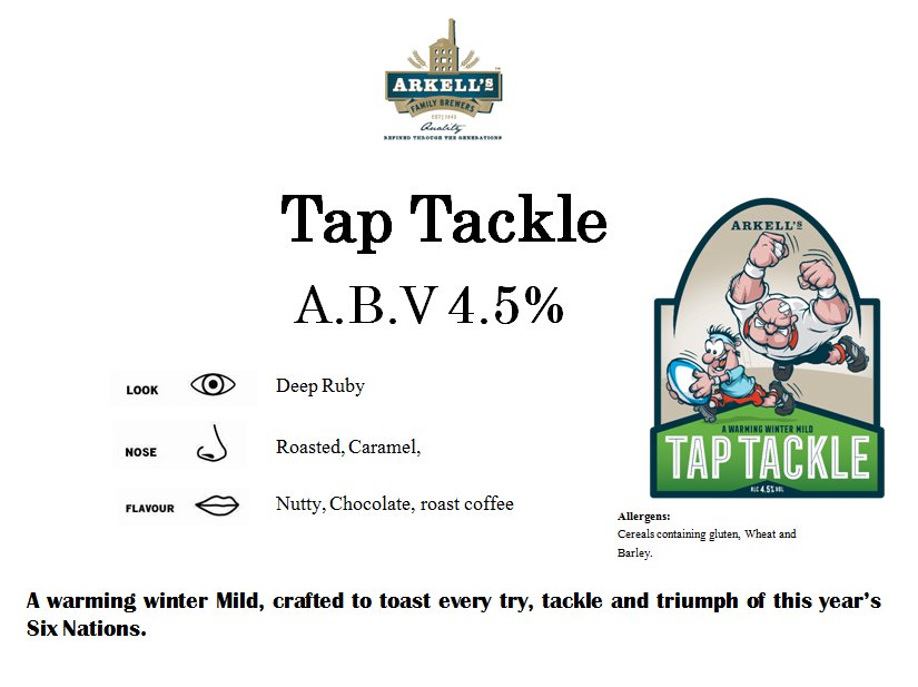 In time for this year's Six Nations, we are introducing a new, seasonal cask beer: Tap Tackle, a 4.5% warming, winter mild. Brewed to be smooth, malty and easy-drinking, it is designed as the perfect match-day pint for rugby fans looking for a flavoursome, yet sessionable, beer through February and March.